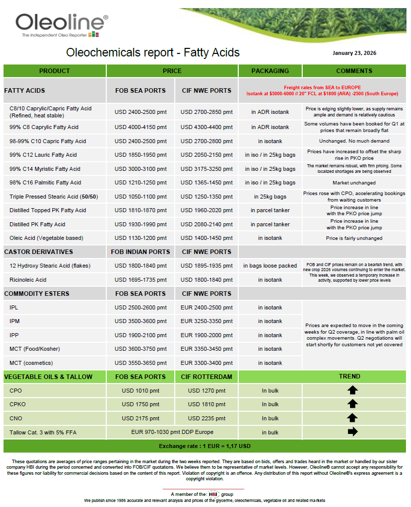 Oleochemicals market prices chart, includes products, prices, packaging, and comments.